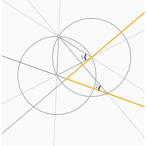 Euclidea三角形垂心,過一點作與直線相切的圓,作六十度角 2024-09-032024-08-10 by ejsoon ∠1跟∠2是同弧的圓心角和圓周角,因此∠1=2∠2。而∠1明顯是60°,則∠2是30°。則證明著色的角是60°。 Pages: 1 2 3 4 5 6 7 8 9 10 11 12