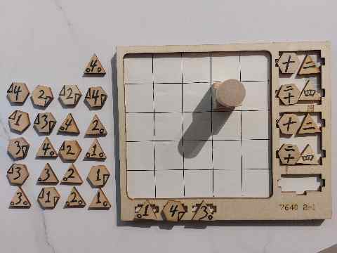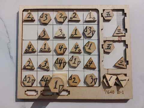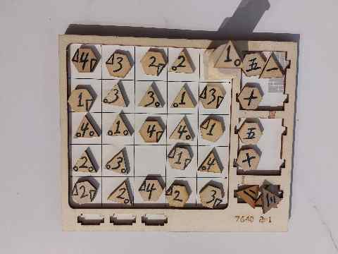 - 數字:24個單面數字板,分別為1、2、3、4,上面有六種圖案,分為六邊形和三角形,雙方共用