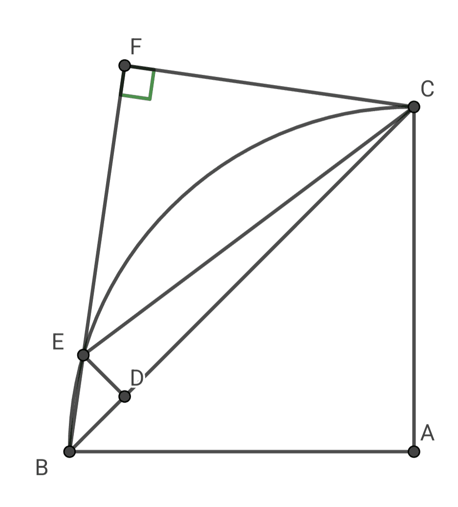 求四分之一圓的弦長 2025-09-012025-07-13 by ejsoon 相似三角形 作輔助線,延長BE,過點C作垂線,垂足為F。 可知\angle{FEC}為45°,則\triangle{FEC}為等腰直角三角形,FE=FC。 則這兩個三角形相似: \triangle{BDE}∼\triangle{BFC} 設FC=x,推出: \cfrac{x}{x+5}=\cfrac{3}{4} 算得x=15,則弦長為25。 Pages: 1 2 3 4 5 6 7